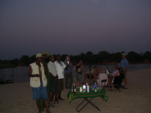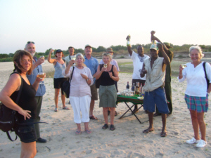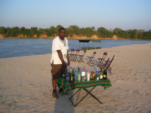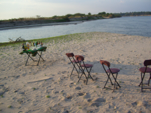 Sundowner Drink auf einer Sandbank im Rufiji Fluss. Dies ist ein Extra zu einem Tag innerhalb der Safari Parks oder nach