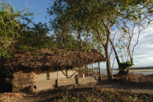 Ein grünes Dach aus Zweigen und Blättern, das tagsüber fast immer Schatten bietet, bedeckt das Camp. Diese Bäume werden