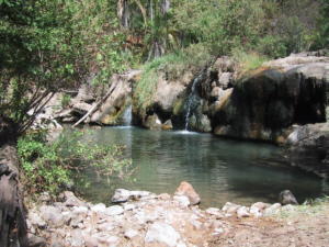 bewachsene Schlucht erreicht werden. Heißes, schwefeliges Wasser entspringt aus den Felsen, ergießt sich in kleinen Bächen bergabwärts und bildet eine Reihe von malerischen Lachen. Eine heiße Quelle wie diese war